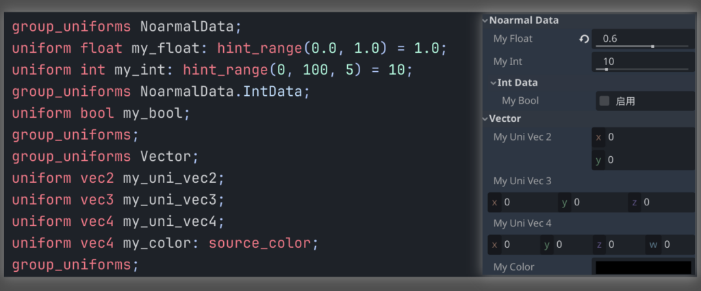 - shader type:有canvas_item,spatial,particle,sky,fog.其中2D Shader使用canvas_item,3D Shader使用spatial,其他类型不常用